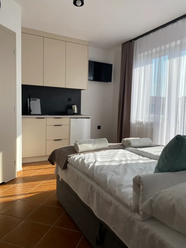 Wygodny apartament 4-osobowy z balkonem i pełnym wyposażeniem, w tym klimatyzacją i aneksem kuchennym. Zapewnia komfortowy pobyt zarówno na weekend, jak i na dłuższy urlop. Położony w cichej części pensjonatu.